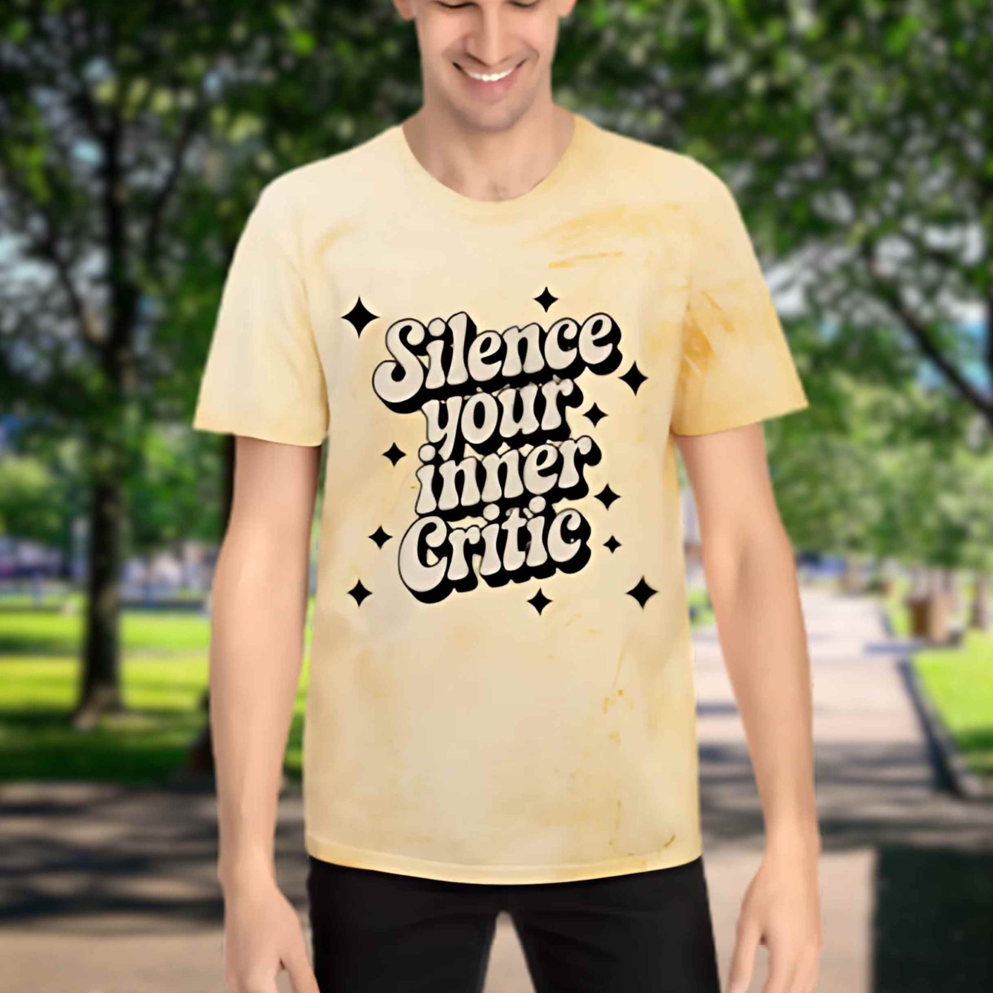 Silence Your Inner Critic Shirt – Retro 70s Wavy Text Tee, Mental Health Awareness, Positive Self-Talk T-Shirt, Pink Marble Comfort Tee