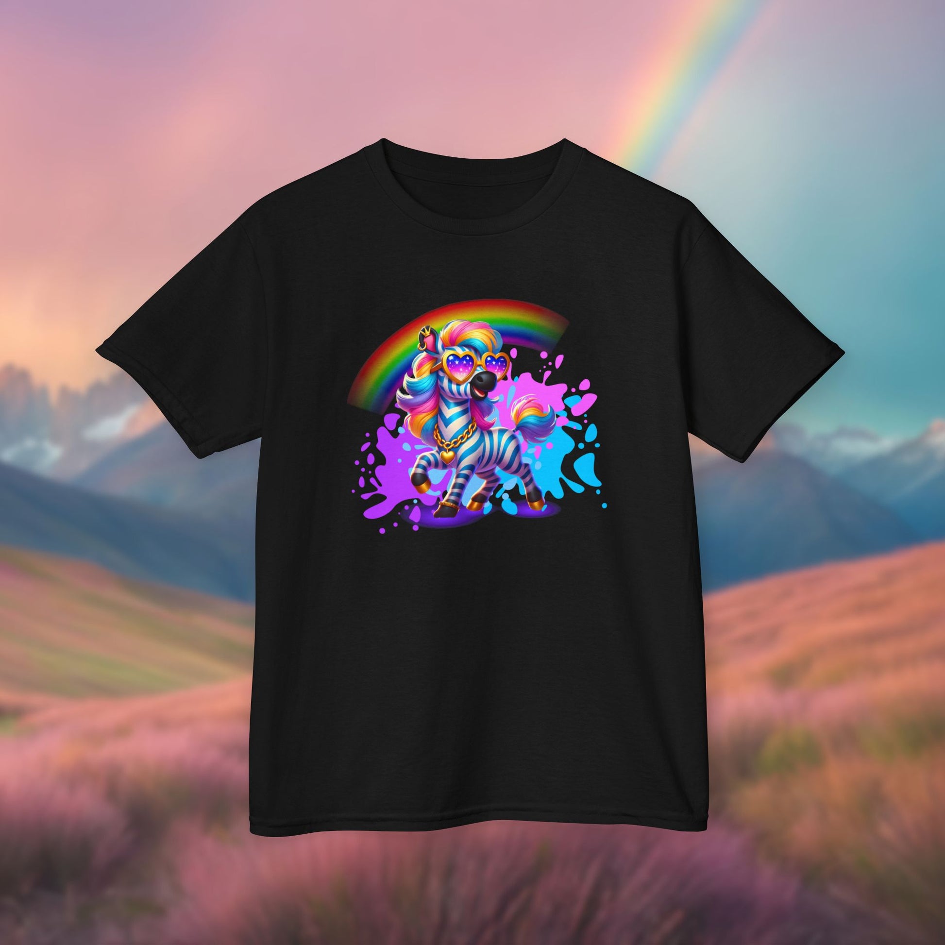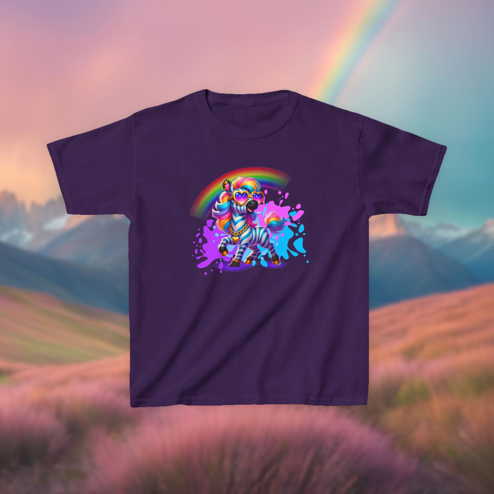 Let Zara the Zesty Zebra add a splash of boldness to your wardrobe! From the Colorful Kingdom of Imaginaria, Zaraβs here to inspire confidence, creativity, and a little bit of sass. With her rainbow stripes and paint-splattered backdrop, this youth tee is perfect for kids who love to stand out and express themselves.